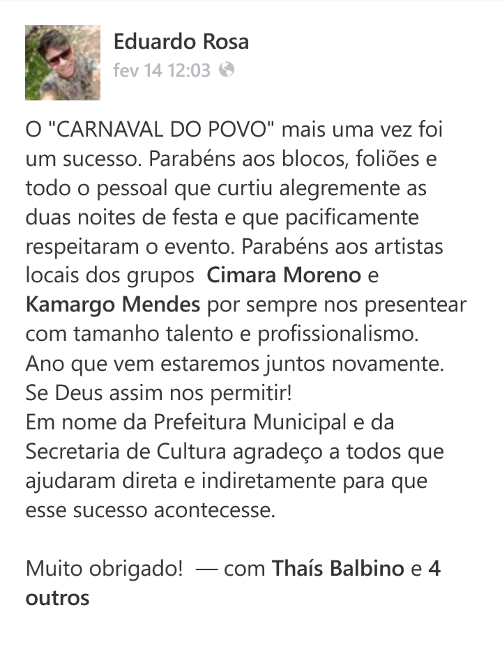 O prefeito Alessnadu Alves (PROS), através da secretaria de Assistência Social e das diversas outras pastas, agradeceu o empenho de todos para colocarem as diversas ações, nas ruas, durante o período carnavalesco. “Fico feliz em ver nossa festa acontecer. Um movimento que é realizado para todos: os blocos, as famílias e o nosso povo camporedondense. Agradeço a cada funcionário, que mesmo em um momento de confraternização estão fazendo a festa acontecer”, contou.