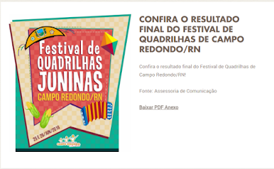 A Comissão julgadora do Festival de Quadrilhas Juninas divulgou agora a pouco o resultado oficial das grandes campeãs nas categorias estilizada e tradicional. O resultado final foi divulgado no Portal da Prefeitura Municipal de Campo Redondo no endereço www.camporedondo.rn.gov.br. No site você pode conferir as notas em todos os requisitos analisados pela comissão julgadora do evento.