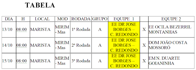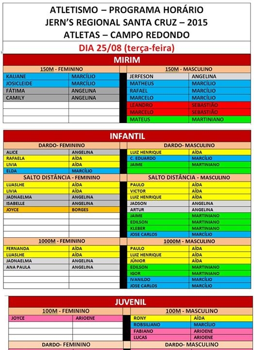 Confira a Tabela do atletismo, do futsal com a relação dos atletas das três escolas municipais de Campo Redondo que participarão da 8ª edição dos JERNS da Regional Trairi e Potengi que terá sua abertura na próxima segunda-feira, dia 14 de julho a partir das 16 horas no estádio Iberezão em Santa Cruz/RN.